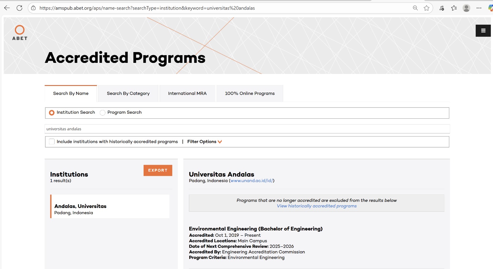 Terakreditas ABET(Klik Disini) Dokumen ABET ENVIRONMENTAL ENGINEERING UNIVERSITAS ANDALAS (Klik Disini) |