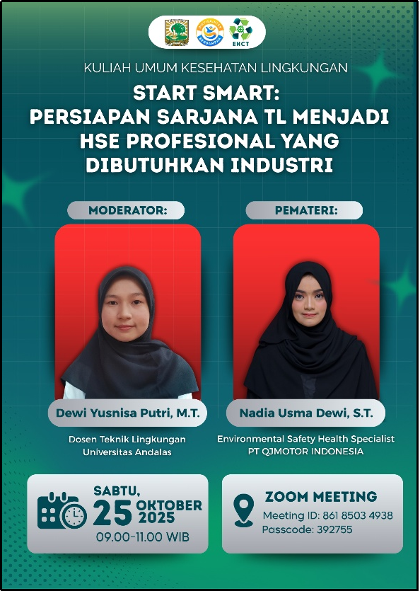 Untuk membuka wawasan mahasiswa terhadap peluang karier di bidang ini, pada 25 Oktober 2025 Departemen Teknik Lingkungan Universitas Andalas menyelenggarakan kuliah umum bertajuk “Start Smart: Persiapan Sarjana TL Menjadi HSE Profesional yang Dibutuhkan Industri.”