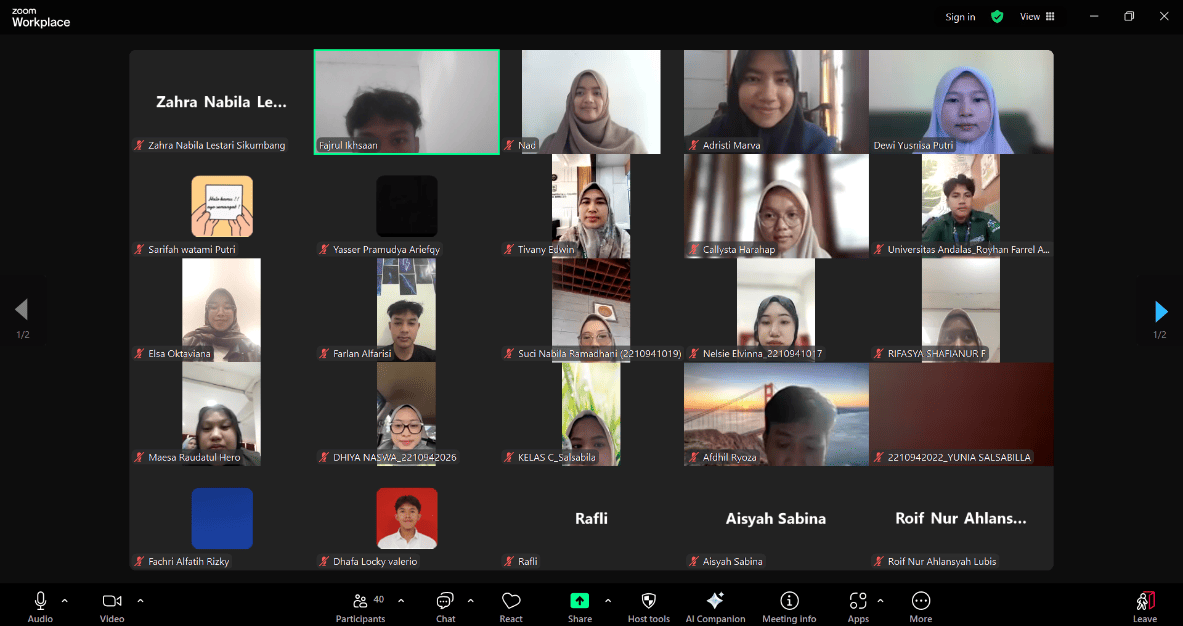 Kegiatan ini dilaksanakan secara daring melalui Zoom Meeting dan dimoderatori oleh Ibu Dewi Yusnisa Putri, M.T, dosen Departemen Teknik Lingkungan. Kuliah umum menghadirkan Ibu Nadia Usma Dewi, S.T, alumni Teknik Lingkungan Universitas Andalas Angkatan 2018 yang saat ini berkarier sebagai Environmental, Safety, and Health Specialist di QJ Motor Indonesia. Melalui pengalamannya di industri, beliau membagikan banyak wawasan menarik tentang dunia HSE mulai dari peran pentingnya dalam mendukung keberlanjutan perusahaan, peluang besar bagi lulusan Teknik Lingkungan, hingga langkah-langkah strategis untuk memulai karier sebagai HSE profesional.