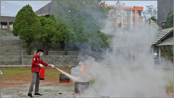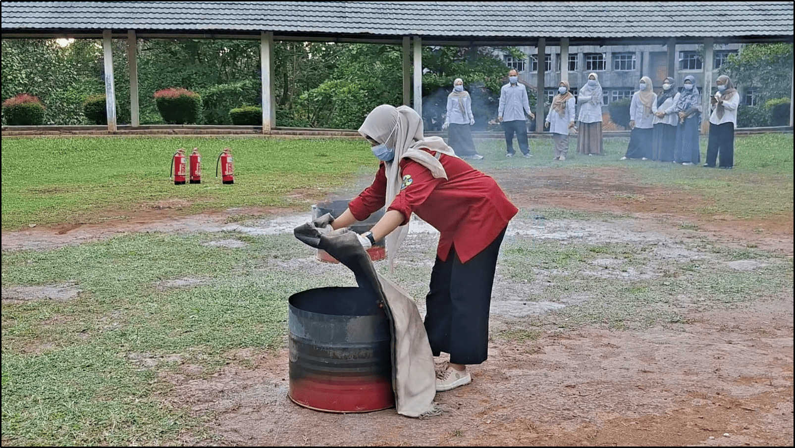 Setelah sesi teori, peserta langsung turun ke lapangan untuk praktik penggunaan APAR. Pada sesi ini, mereka mempelajari langkah-langkah memadamkan api dengan benar, termasuk posisi yang aman, cara menyemprotkan media pemadam, dan teknik memutus rantai reaksi api. Simulasi ini membuat peserta lebih percaya diri dan siap menghadapi situasi darurat di lingkungan kampus maupun laboratorium.